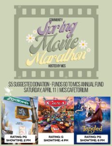 We will be hosting a Spring Movie Marathon on Saturday, April 11! We will be showing three movies between 2-8 PM. Proceeds from this event will go to our MCS Annual Fund. There will be concessions available for purchase. The suggested donations per person is $5. We will be showing the movies in the MCS Cafetorium, please enter through the Cafetorium entrance. All students 5th grade and under must be accompanied by an adult.