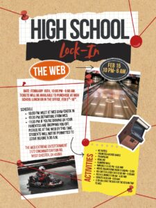 Our High School Lock-In will take place February 15, from 10 PM to 6AM. It will take place at the Web Extreme Entertainment Center in West Chester. Tickets will be available for purchase for $35 at High School Lunch February 5-10th. You don’t want to miss it! Check out the schedule in the graphic for a full list of activities.