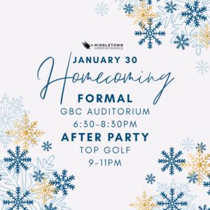 All MCS High School Students are invited to the 2026 Homecoming Formal & After Party! Students are invited on January 30 to come to the GBC Auditorium at 6:30 PM and have snacks and drinks, with opportunities to take pictures dressed in your formal wear. Dinner will not be provided, we encourage students to eat before they come. In the auditorium they will get to watch and participate in a Battle of the Classes Gameshow hosted by the Cincinnati Circus Company! The after party will take place at Top Golf from 9 PM to 11 PM. There will be snacks and drinks provided. Transportation will also be provided to and from the after party, or students are welcome to drive themselves. Pick up from door 1 at GBC will be at 11:45 PM.