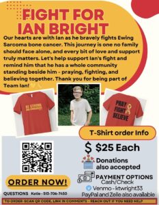 If you prefer to give a monetary gift to the Proffitt family in lieu of buying t-shirts, you are welcome to give directly via Venmo, Zelle, PayPal to ktwright33 (Katie Wright) who has organized the t-shirt fundraiser. Questions can also be directed to Katie at (513) 706-7450. Thank you for helping us show love and support to this dear family. Please commit to faithfully lift Ian and the entire Proffitt family up in prayer.
